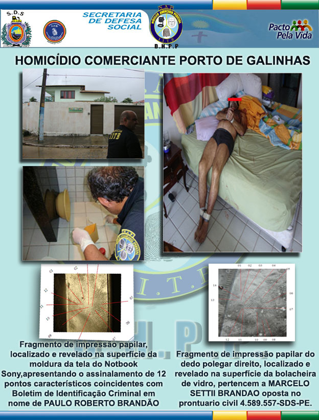 Na residência onde fora encontrado o corpo da vítima de homícidio, os Peritos Papiloscopistas localizaram diversos fragmentos papilares, dos quais os revelados na superfície de uma bolacheira de vidro e na superfície de um notebook (que foi encontrado no quarto de hospedagem dos suspeitos em uma pousada próxima ao fato) foram positivados com dois homens suspeitos apresentados no decorrer das investigações.