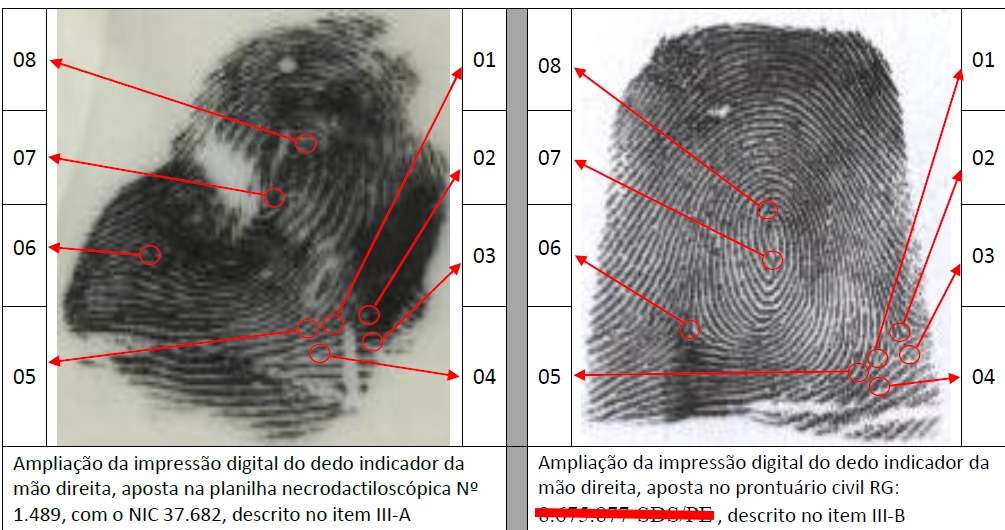 Peritos Papiloscopistas do NAP/IITB/DHPP, concluíram após exames de confrontação, que o fragmento papilar revelado na superfície de um pote plástico encontrado no quintal da casa da vítima, foi reproduzido pelo dedo indicador esquerdo do